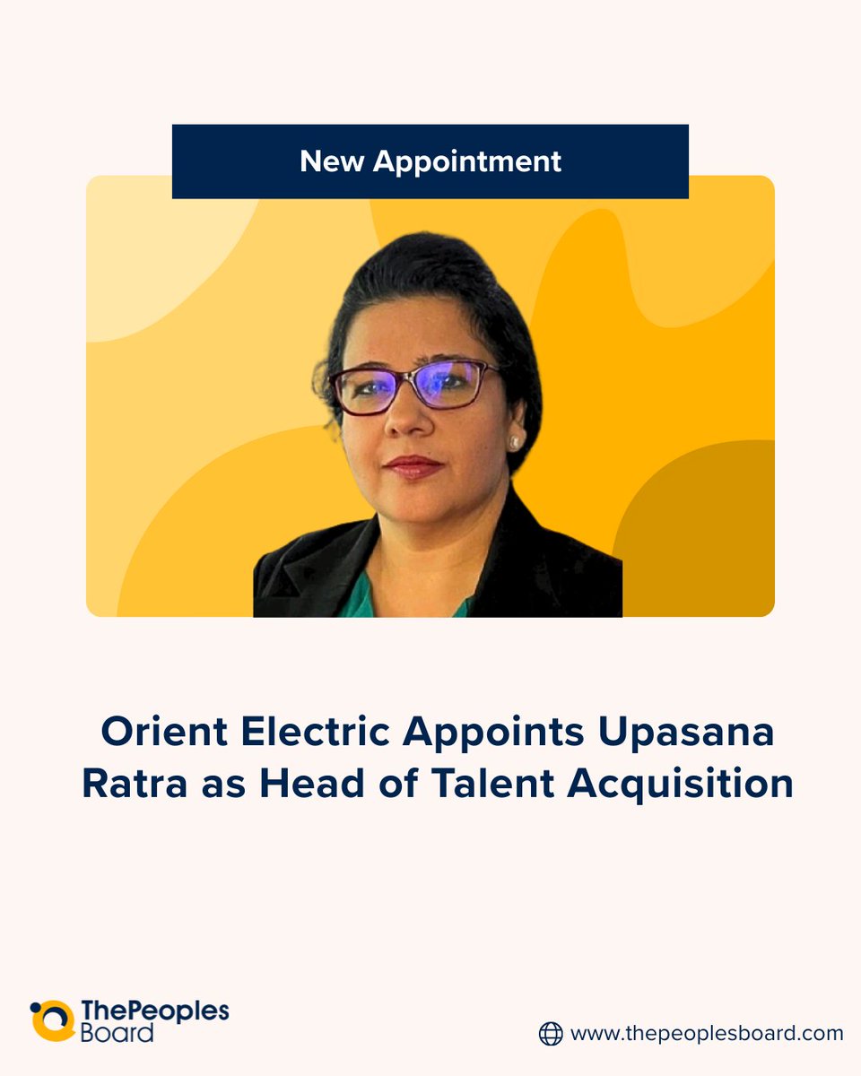 ЁЯЪи Upasana Ratra Appointed as Head - Talent Acquisition at Orient Electric. Read more: thepeoplesboard.com/news/orient-elтАж #OrientElectric #PeopleUpdate #LeadershipMoves #TalentAcquisition #HRExcellence #ThePeoplesBoard