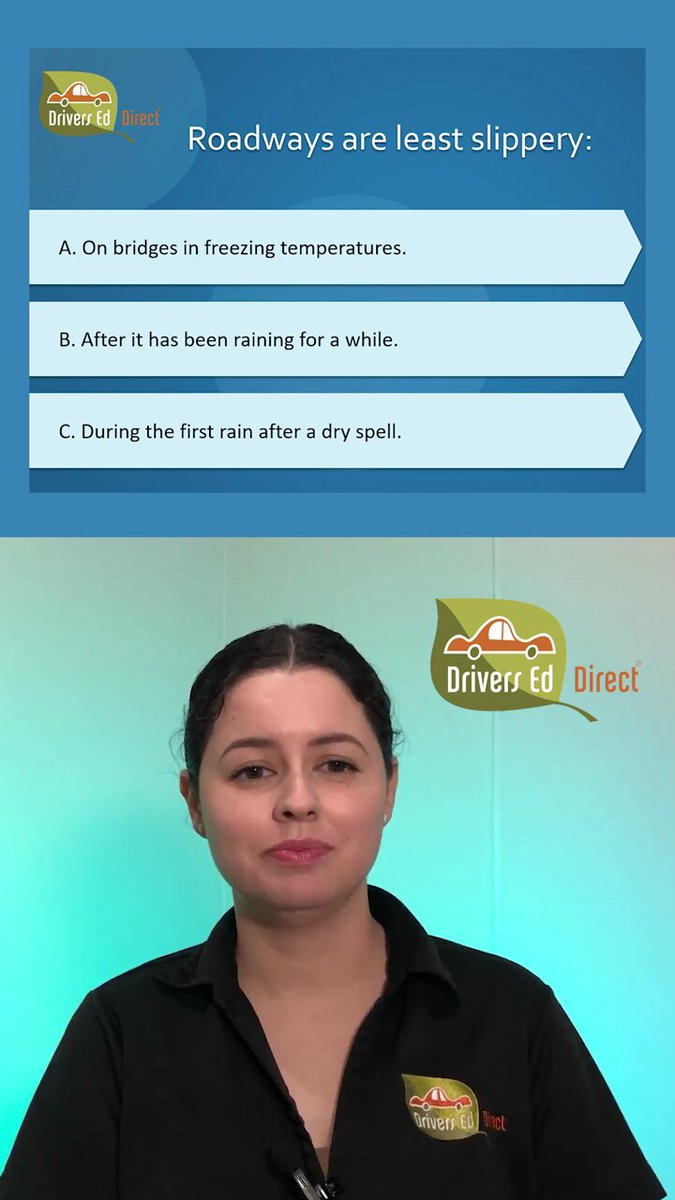 When are roads least slippery? 💦 Take a quick guess before you watch! 👇 A) Bridges in freezing temps B) After it’s been raining C) First rain after a dry spell Watch the answer from Permit Quiz Liz! #PermitQuestions #PermitQuizLiz #DriversEdDirect