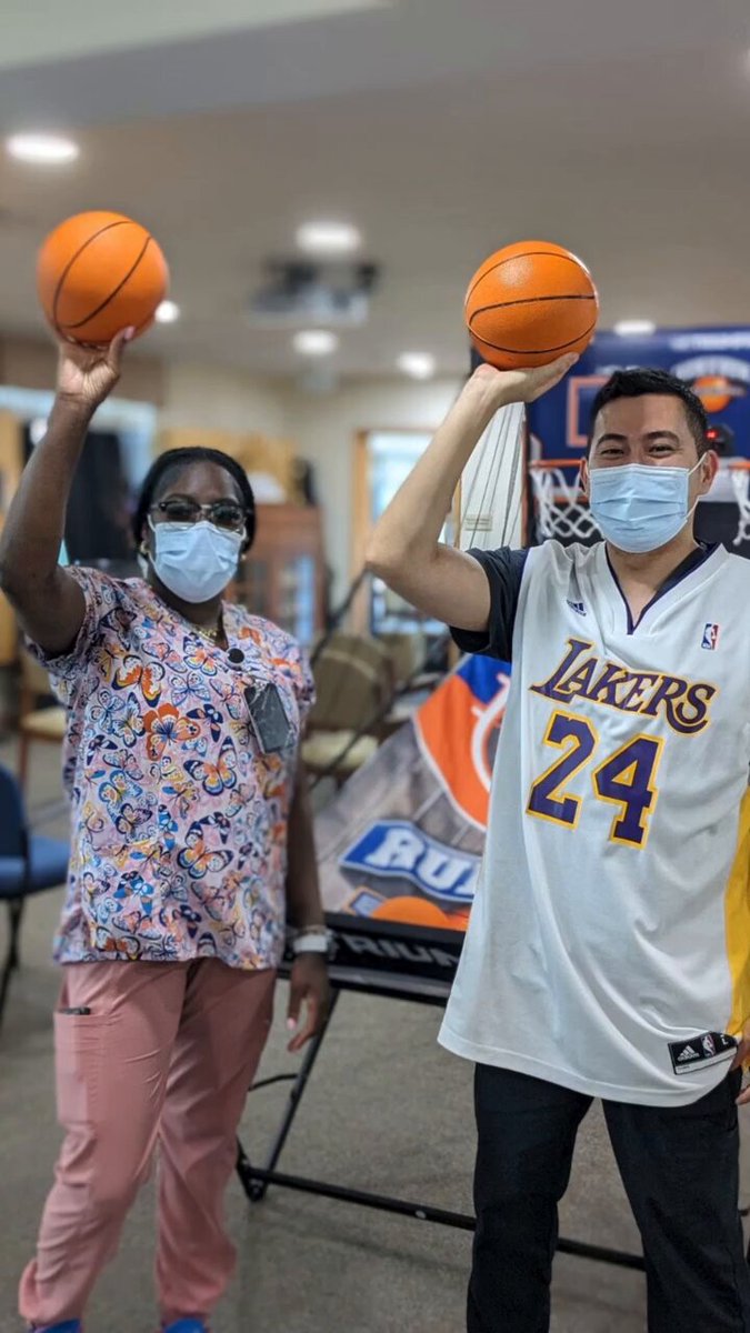 UHS' #PSWWeek activities continue with games for all staff! On Jersey Day staff went toe to-toe-in a free throw championship. Congratulations to top-scorers Nurse Naveed and #PSW Shanique who both won Tim Hortons gift cards! #PersonalSupportWorker #LTC #seniorscare #seniors