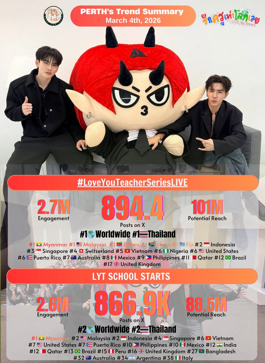 📈 #PerthTrend Summary March 4th, 2026 @perthppe @Ppsanta @domiia_GMMTV @GMMTV @Love_YouTeacher Thank you for your support and participation in the trending party on X together 😊🙏🏻 #LoveYouTeacherSeriesLIVE ◼️Total Results: 894.4K+ Posts ◼️Engagement: 2.7M ◼️Potential Reach: