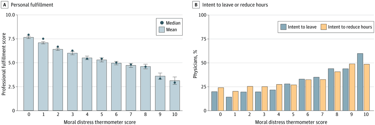In a national survey, US #Physicians reported higher #MoralDistress than other workers, with increased prevalence of #Burnout, intent to leave, and intent to reduce hours for each 1-point increase in moral distress on a 10-point scale. ja.ma/3NzS7mW