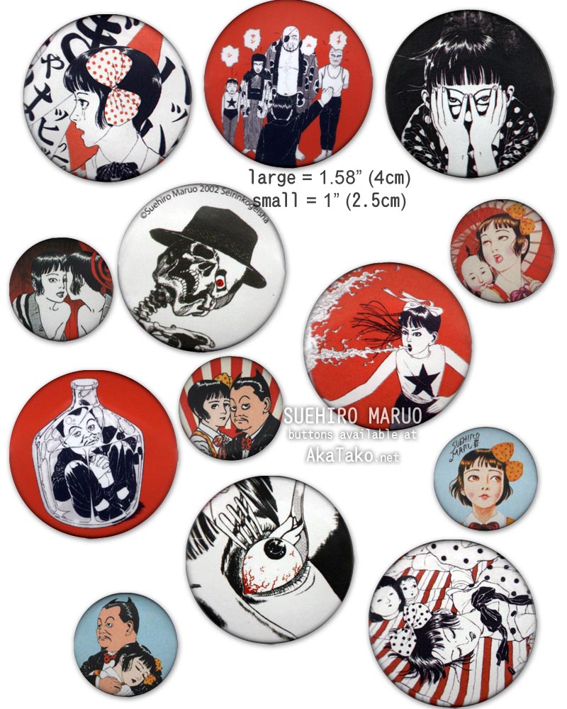 Buttons & pins are 25% off until end of July. Suehiro Maruo pin-back buttons shown here. Coupon code = JULY25. akatako.net/catalog/japane… @maruojigoku #suehiromaruo #buttons #pinbackbuttons #canbadge #artbuttons #art #japaneseart #akatako #sale #summersale #丸尾末広 #缶バッジ