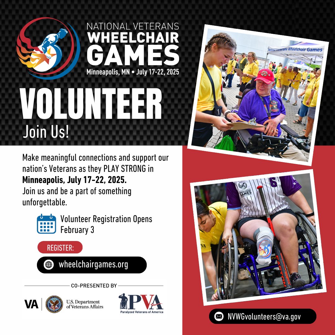 Volunteer and make meaningful connections and support our nation’s Veterans as they PLAY STRONG in Minneapolis, July 17-22. Click the volunteer tab on the website at wheelchairgames.org #Volunteer #WheelchairGames #PlayStrong @VAminneapolis @pva1946 @meetminneapolis
