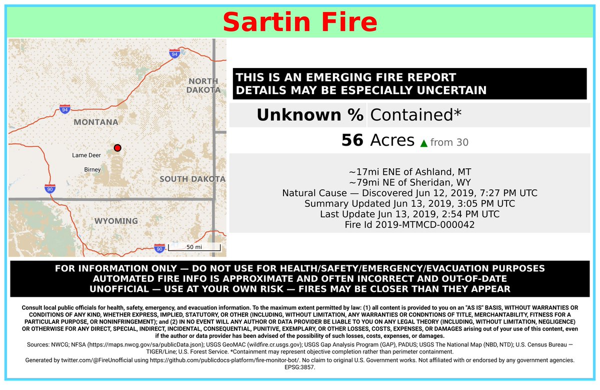 #SartinFire 🔥 discovered Jun 12, 2019, 7:27 PM UTC - unofficial report. #PowderRiverCounty Miles City Field Office; ~17mi ENE of Ashland, MT. ~79mi NE of Sheridan, WY. See officials for safety info. May be incorrect; disclaimers in images.
