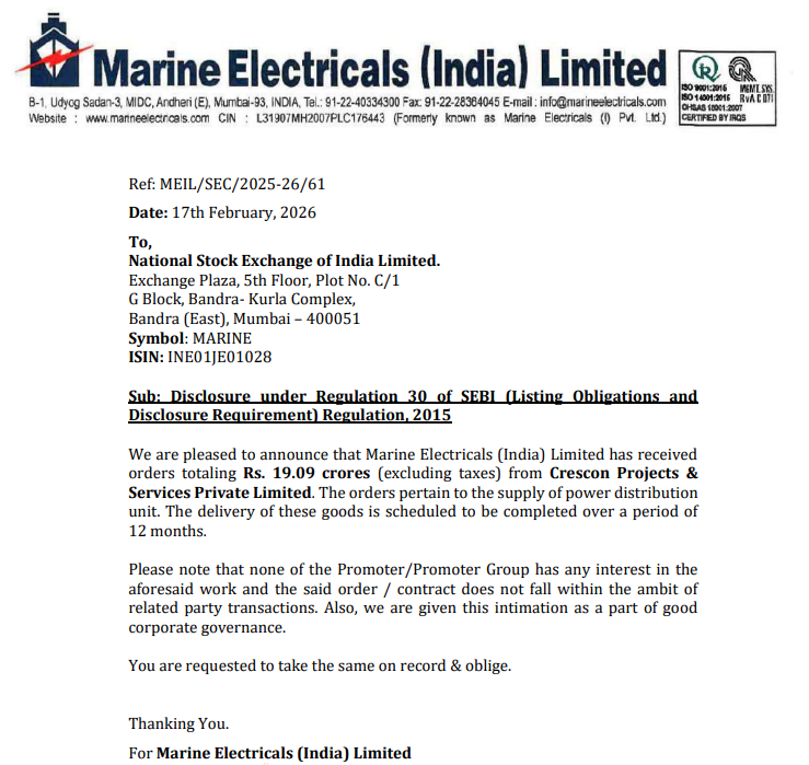 ⚡ Marine Electricals wins ₹34.09 Cr order from Electromech Infraprojects 👉🏻 Receives orders worth ₹34.09 Cr 👉🏻 Order from Electromech Infraprojects Limited 👉🏻 Scope: Supply of power distribution units 👉🏻 Execution timeline: 12 months #MARINE #OrderWin #PowerDistribution