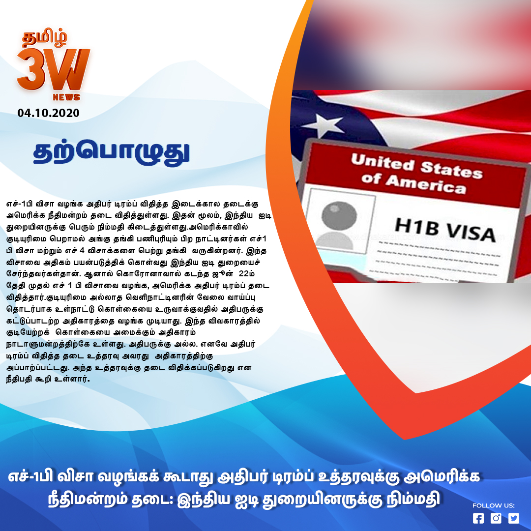 எச்1பி விசா வழங்கக் கூடாது அதிபர் டிரம்ப் உத்தரவுக்கு அமெரிக்க நீதிமன்றம் தடை: இந்திய ஐடி துறையினருக்கு நிம்மதி #3WNewsTamil #USCourtBans #PresidentTrumpOrder #H1BVisas #IndianITIndustry @indianitcompany