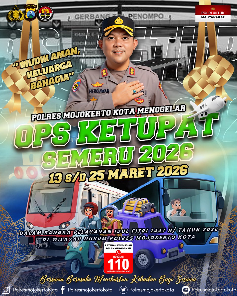 Tak Kasih Inpo Bolo... Polres Mojokerto Kota Menggelar Ops Ketupat Semeru 2026 Mulai Tanggal 23 s/d 25 Maret 2026 "Mudik Aman Keluarga Bahagia" #OpsKetupat2026 #Ramadan #Presisi #PolriUntukMasyarakat #110 #PolresMojokertoKota #KotaMojokerto