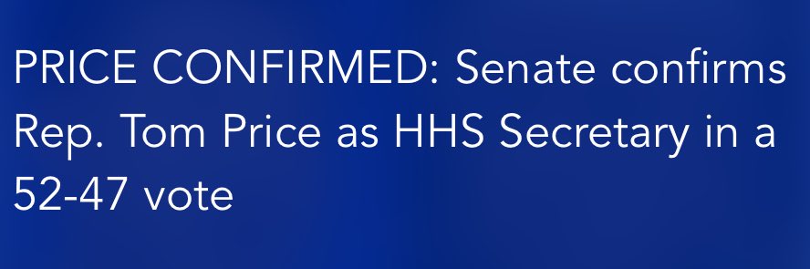 In the wee small hours of the morning, Rep. Price confirmed as HHS Secretary on a 52-47 vote #PriceConfirmation ow.ly/aPPh308St55