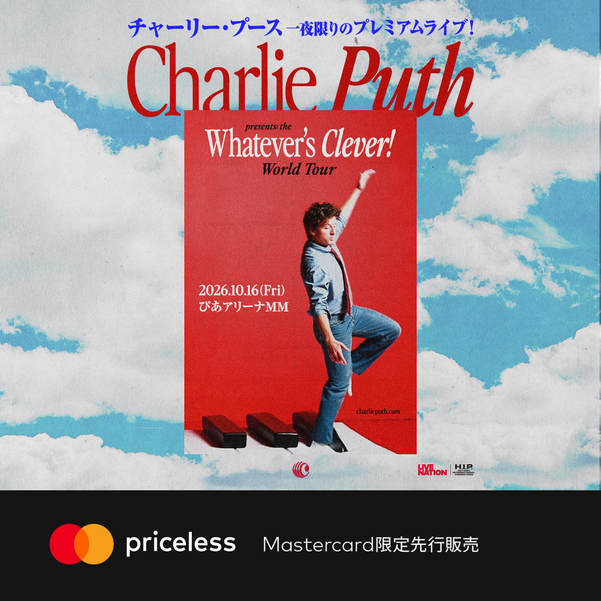 Mastercard会員様限定、Charlie Puth(チャーリー・プース)東京公演チケットの先行販売が決定! 2026/4/21(火)正午12:00 ~ 4/22(水)午前11:59まで、先着順でチケットを購入可能。 公演は2026/10/16に東京で開催。 priceless.com/music #Priceless #PricelessExperience #Mastercard