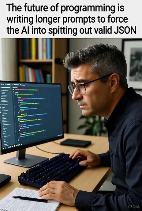 The future of coding: Trading semicolons for 2,000-word therapy sessions with GPT. 'Be valid JSON or else.' Who's already prompting more than programming? Spill your longest prompt horror! 🤖📝 #DevHumor #AIMemes #ProgrammerLife