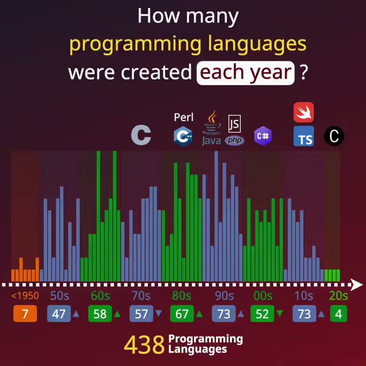 How many programming languages were created each year? A Visual History of Programming Languages. #programminglanguages #historyofprogramming #programmingtrends