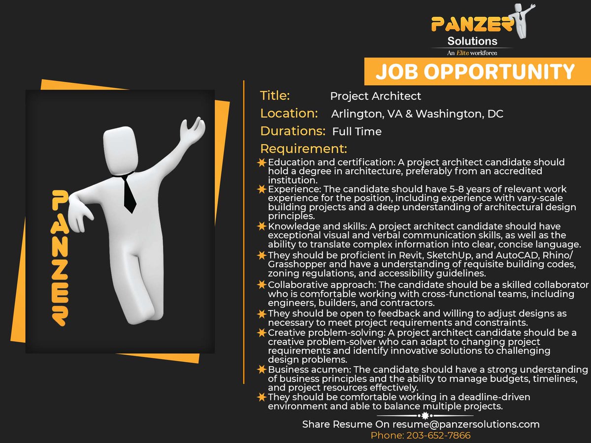Job Title: Project Architect Location: Arlington, VA, and Washington, DC Duration: Full Time Share resumes at [email protected] Or for more job requirements, click on the below link Click Here: panzersolutions.com/jobopportunuti… #projectarchitect #architect #jobs #virginia