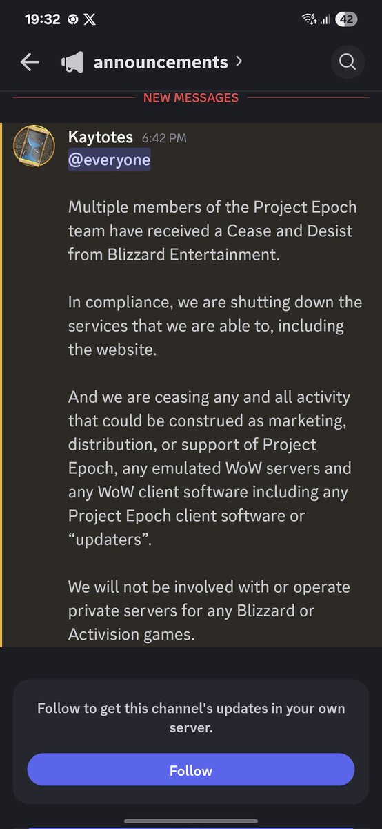 Another World of Warcraft rogue server, Project Epoch, has been smacked with a Blizzard cease and desist 🔗 massivelyop.com/2025/09/09/ano… #MMORPG #WorldofWarcraft #ProjectEpoch @warcraft