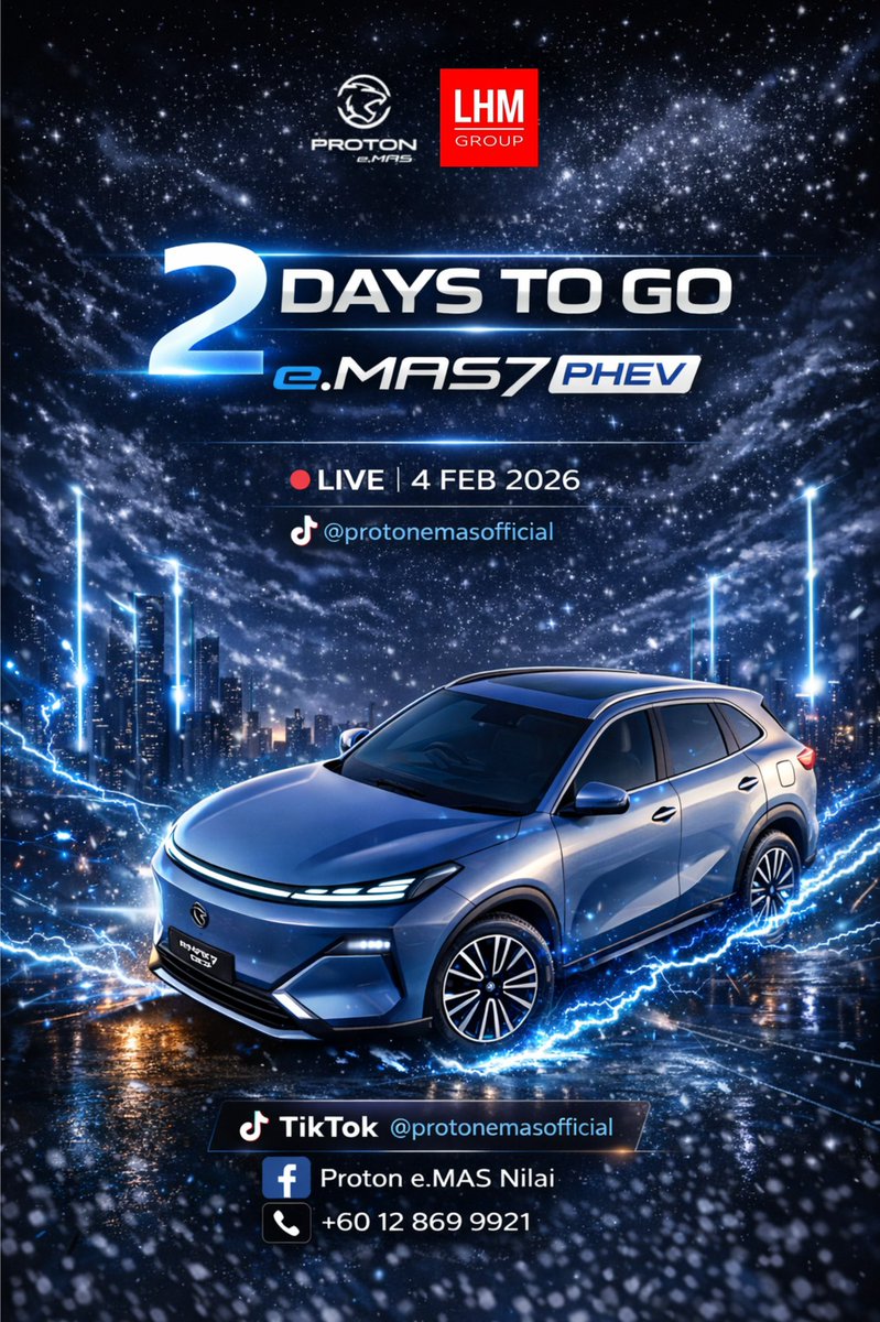 2 more days! Proton e.MAS 7 PHEV, Malaysia’s 1st Dual-Powered EV, will be open for booking via the official livestream on 13 Jan, 6PM on Facebook and TikTok, @protonemasofficial. Can’t wait? So are we. Mark your calendar! #PROTONeMAS #PROTONEV #INSPIRINGCONNECTIONS #emas7PHEV