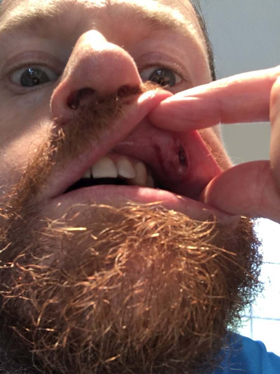 Had to miss the show today after getting a puck to the lip last night at hockey. Wish I could say it hit my nose too, but that’s just big on its own. Thanks to the amazing @JenPalmaGlobal for filling in - this is way cheaper than Botox… #FullCageComing @canucksalumni #PuckFace