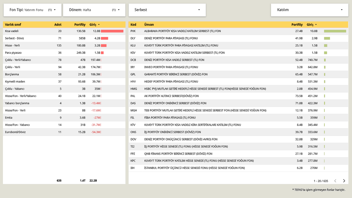 ➡️Son 1 haftada varlık sınıflarına göre para giriş ve çıkışları. 📍Kısa vadeli fonlar haftalık 12,8 Milyar TL girişi ile 1. sırada. Hangi fonlar olduğuna bakınca #PVK - ALBARAKA PORTFÖY KISA VADELİ KATILIM SERBEST (TL) FON 10,8 Milyar ile açık ara önde. Sadece bu fonun para