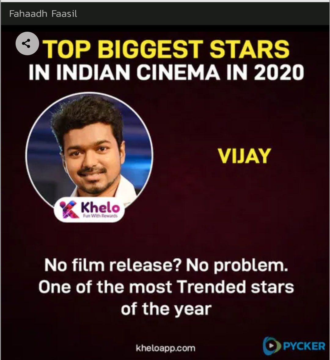 Top Biggest Star in Indian Cinema in 2020 #khelo #pycker #Master | @actorvijay @VijayFansTrends | @OTFC_Off @GuRuThalaiva @Official_Tvmp @Kettavan__Memes @ramk8060