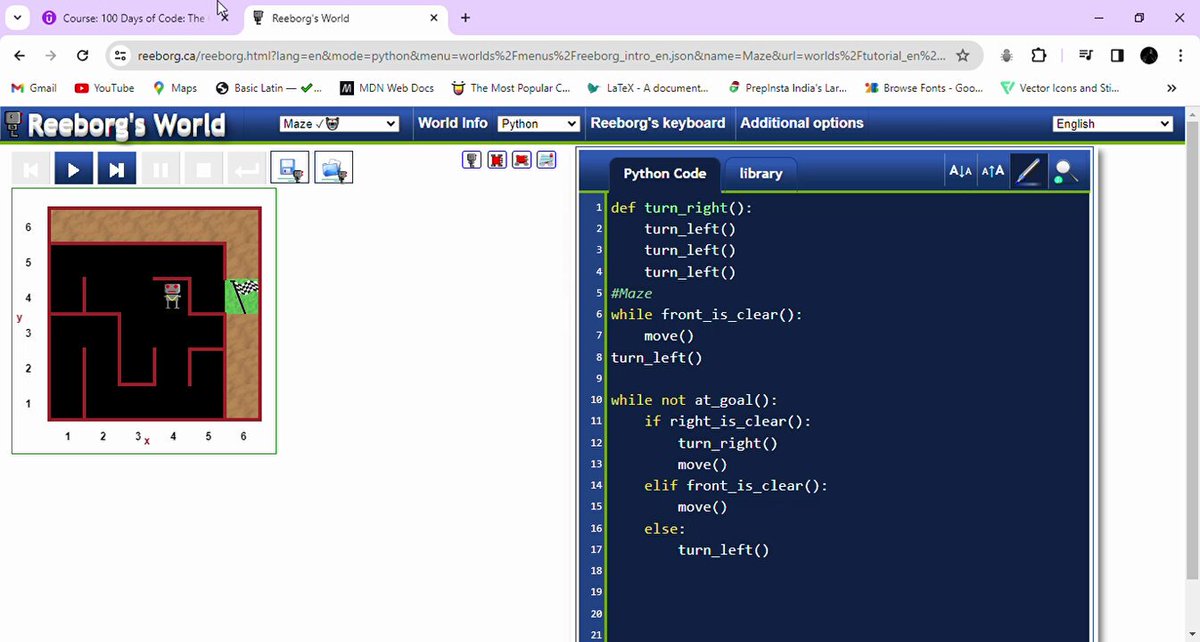 Day 6 of #100DaysOfCode: Python superpowers level up! 🦸♀️🐍 Mastered functions, embraced indentation, conquered while loops, and cracked the 'Escaping the Maze' final project in Reeborg's World! 🌍💻 #PythonWizardry #CodeEscapades