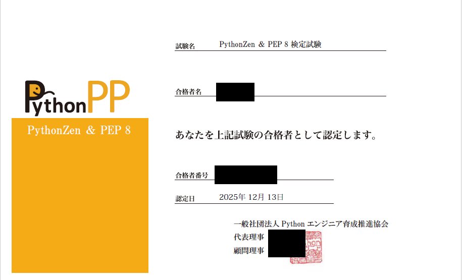 PythonZen & PEP 8 検定試験に合格しました! 合格したらこういう認定書がメールで届きましたよ。 pythonzen-pep8-exam.jp #pythonlearning #pep8 #pythonzen