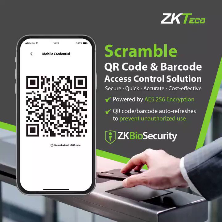 Solution Highlight - Scramble QR Code/barcode auto-refreshes to prevent unauthorized use - Powered by AES 256 Encryption - Quick + Accurate + Cost-effective - Superb Scalability Read more: zkteco.me/solution/scram… #zkteco #qrcode #qrcodeaccess #biometrics