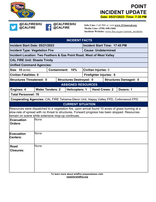 New Incident: #PointFire off Two Feathers Road and Wagon Road Gulch, southwest of Redding in Shasta County is 10 acres and 10% contained. @CALFIRESHU fire.ca.gov/incidents/2023… #QuakeFactor