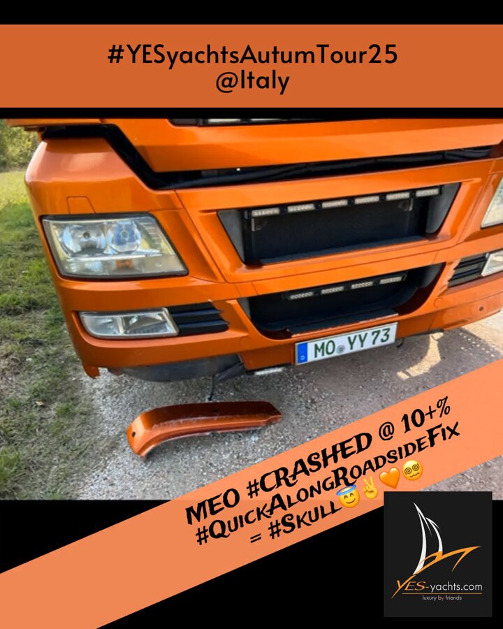#MEO #CRASHED: Just when you think @ 10+% track inclination in Italy, we hit the road with a #QuickRoadsideFix 🧡 Never a dull moment on the #YESyachtsAutumTour25! 😇✌️ #Skull #KeepItMoving #AdventureAwaits #ItalyBound 🤪