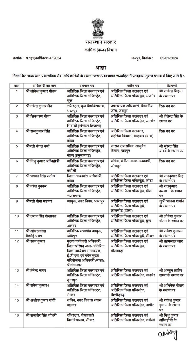 #Jaipur राजस्थान में आज शुक्रवार बड़ा प्रशासनिक फेरबदल, प्रदेश की भजनलाल सरकार ने राजस्थान प्रशासनिक सेवा के 386 RAS अफसरों के किए तबादले,राजस्थान कार्मिक विभाग ने जारी किए आदेश #Rajasthan #RASTransfer @RajGovOfficial @RajCMO @BhajanlalBjp @PoliceRajasthan @Dmsirohi @SirohiPolice