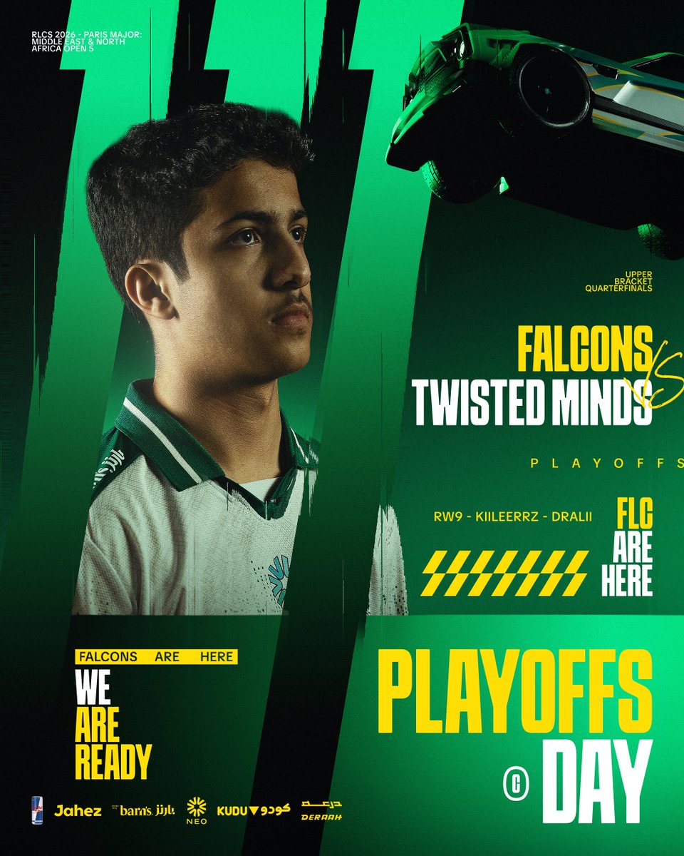 WE ARE GOING TO RLCS OPEN 5 PLAYOFFS أبطالنا يحلقون إلى الأدوار الإقصائية من تصفيات الـ #RLCS الخامسة! 🏎️🦅 — نشوفكم بكرة الساعة 9 في ربع النهائي! 🕘💚 #FalconsAreHere - @RLEsports