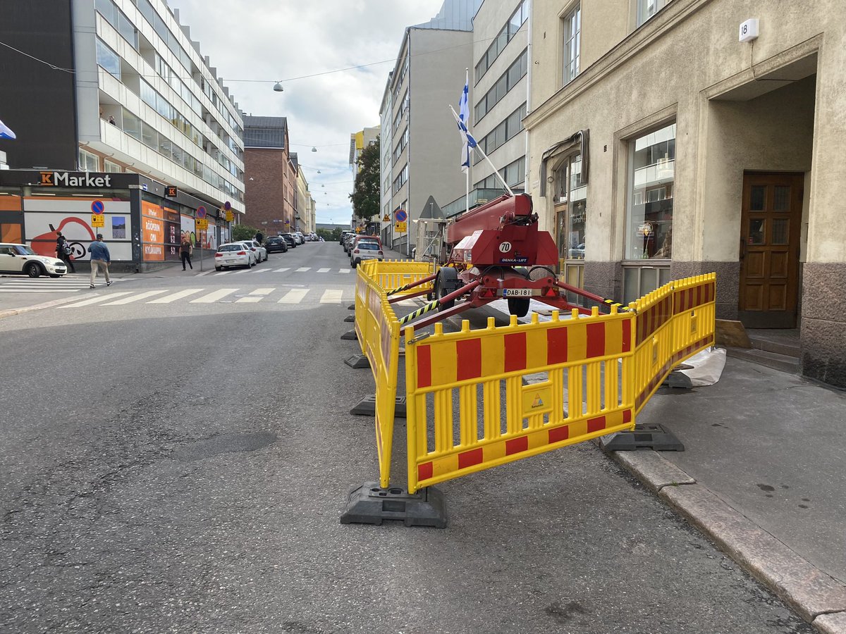 Mitä mieltä ovat @HelsinkiKymp, @DPasterstein ja #Ramudden tämän sijoittelusta? Ollut tuossa torstaista asti ja karttapalvelun mukaan katualue varattu ensi torstaihin asti. Työmiehen ohje ihmettelevälle Snellun menevälle kolmosluokkalaiselle oli ”mene varovasti siitä reunasta”.