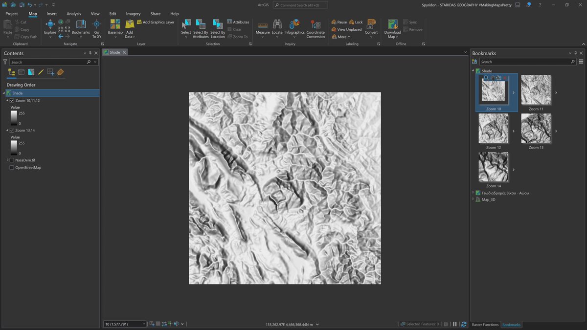 Different generalizations for different zoom levels combined with scale-dependent visibility to produce a multi-scale, multi-directional shaded relief, about to be published as a tile layer for an online map. #NasaDem processed with #RasterFunctions in #ArcGISPro. #cARTography