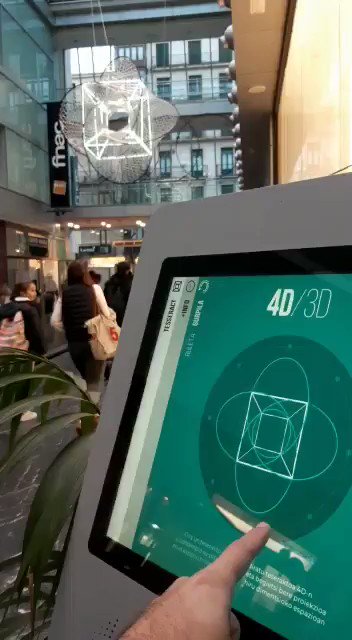 Jugando como un niño más junto a @amaiasebastopol con #Tesseract, el hipercubo luminoso de @andergortazar & Jacek Markusiewiczek (#RAZsolutions) en el @mercado_SM. Moraleja: hay que dejar a la gente con luces que diseñe la iluminación "invernal".