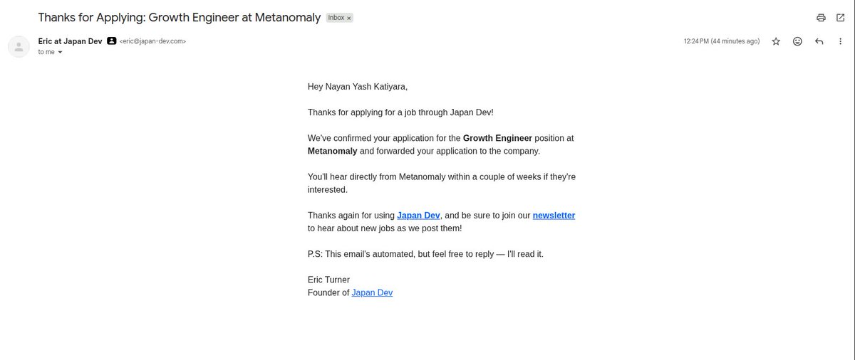 Applied for this role today: Job role: Growth Engineer Company Name: Metanomaly (JapanDev) Heard @nandini__bagga about Japandev, hence trying my luck here. #RecentGrad #JobSearch