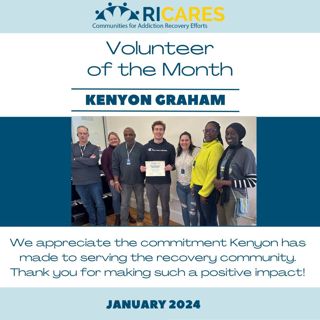 We would like to acknowledge our January Volunteer of the Month, Kenyon Graham! 👏 Thank you for your service to our community, Kenyon! #ricares #recovery #recoveryprogram