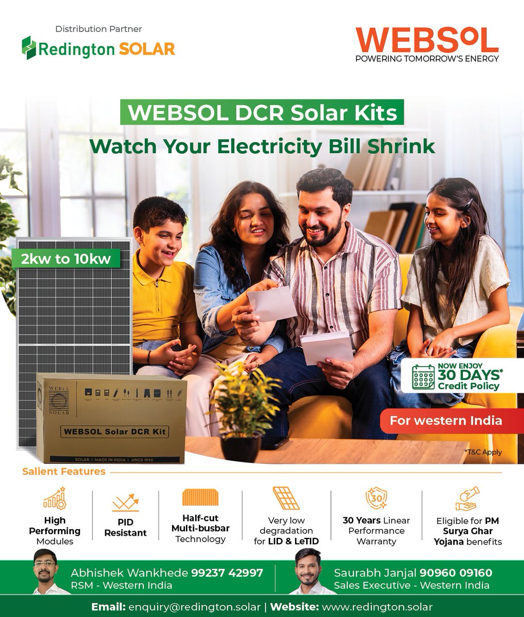 Western India, power up with WEBSOL DCR Solar Kits (2kW–10kW). High performance. Low degradation. 30-year linear warranty. Eligible under PM Surya Ghar Yojana. Enjoy 30 Days Credit Policy with trusted Redington Solar distribution.Let’s grow together. #Websol #RedingtonSolar