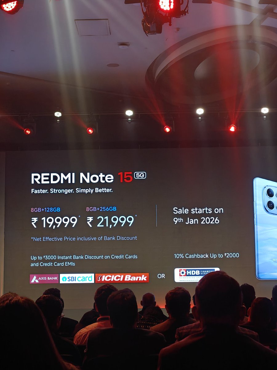 Redmi Note 15 5G launched in India, here’s the price: 8GB + 128GB = Rs 22,999 8GB + 256GB = Rs 24,999 Up to Rs 3k discount with select Cards! #redminote155G @RedmiIndia @XiaomiIndia