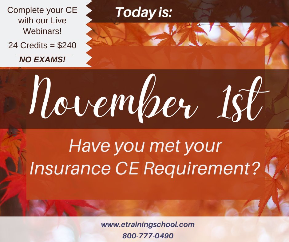 It's November 1st...have you completed your #InsuranceCE requirement? Register now for 24 credits for just $240! Click the link and select your state to view our full calendar: etrainingschool.com/clientsite/Cla… #EasyCE #RemoteCE #November2024