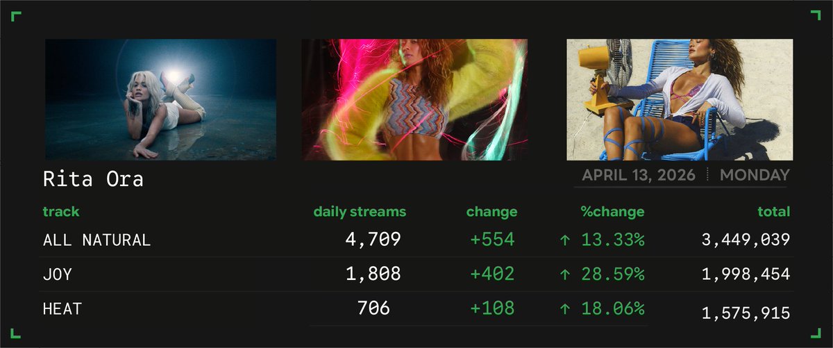 Top Female Albums Daily (April 12, 2026): #1 The Art of Loving 11.76M [+1] #2 Dandelion 11.19M [-1] #3 Man’s Best Friend 10.49M #4 Short n' Sweet 8.83M #5 The Life of a Showgirl 7.68M #6 THIS MUSIC MAY CONTAIN HOPE. 7.36M #7 HIT ME HARD AND SOFT 6.93M #8 Teenage Dream 6.55M #9