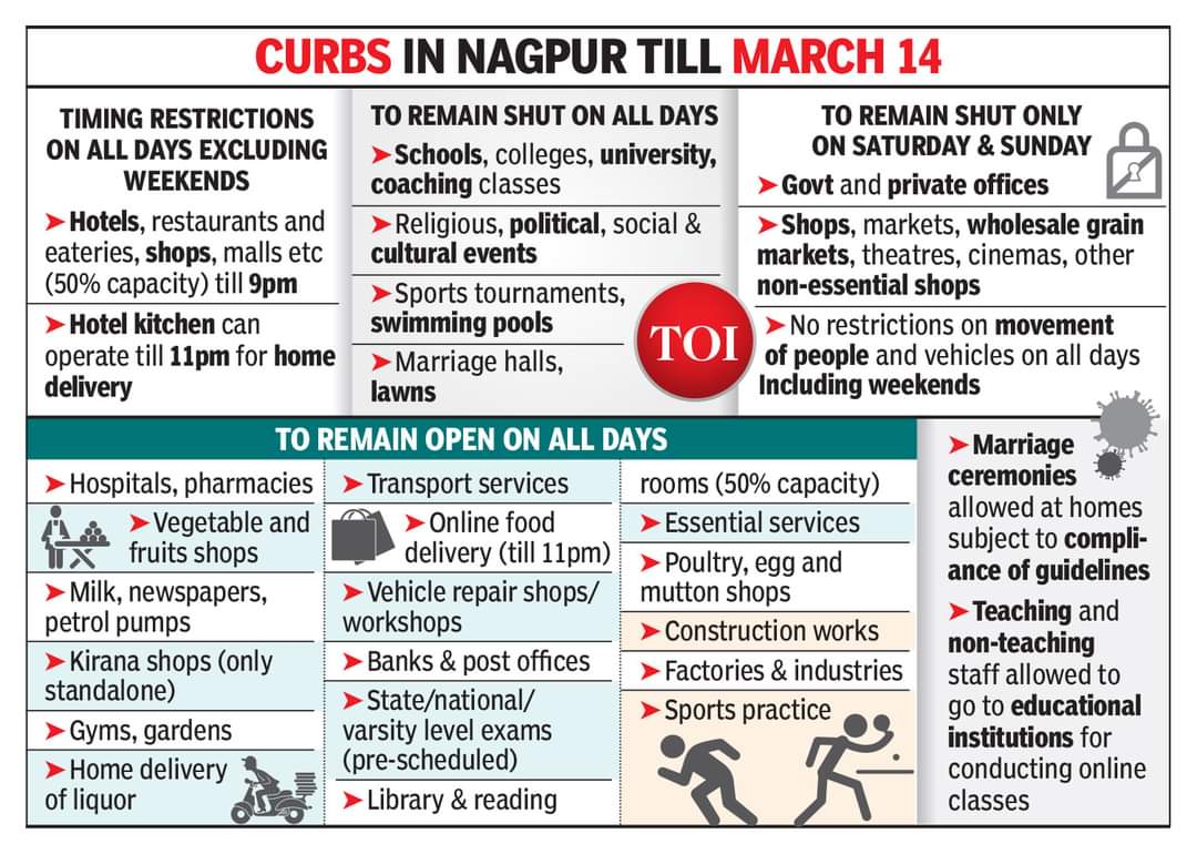 As the Corona cases in the city are seeing a surge, #NMC administration has taken steps to curb the spread of Covid-19. An infographics of restrictions was published in one of the leading newspapers in the city. #RestrictionsExtended #TillMarch14 #TimesOfIndia @TOI_Nagpur