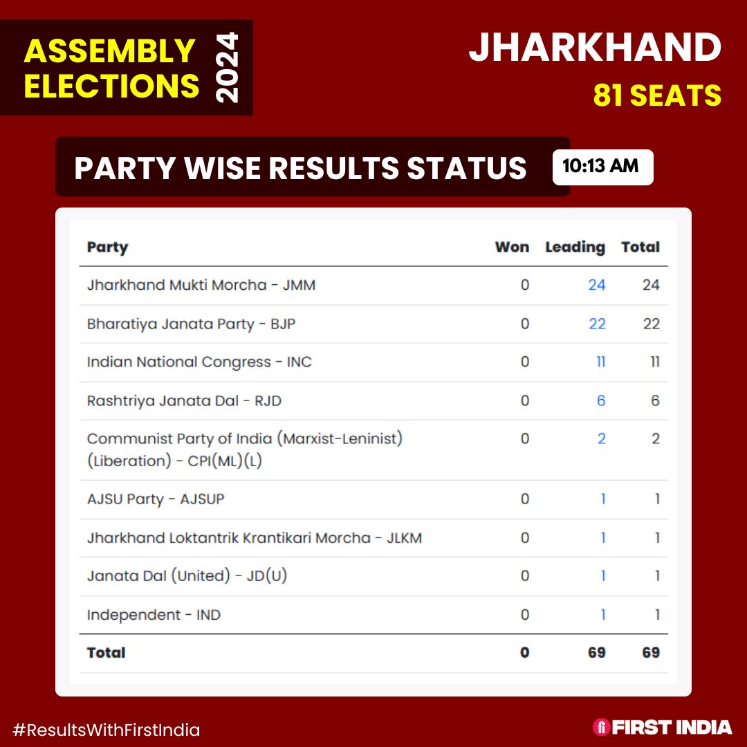#JharkhandAssemblyElection2024 | Initial trends by Election Commission: Mahagathbandhan (43) crosses the halfway mark of 40 (JMM 24, Congress 11, RJD 6, CPI(ML)(L) 2) NDA leading on 26 seats (BJP 24, AJSUP 1, JDU 1) #ElectionResults2024 #ResultsWithFI #ResultsWithFirstIndia