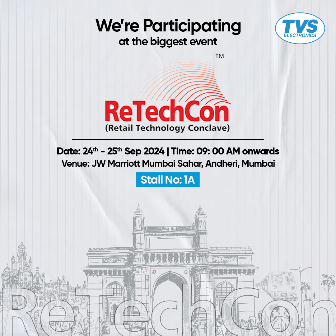 Excited to announce our participation in the biggest #RetailTechnologyConclave! Mark your calendars: 24th - 25th Sep 2024 Stall No: 1A Join us at: JW Marriott Mumbai Sahar, Andheri, #Mumbai Don’t miss out this opportunity to connect with us! #TVSElectronics #TVSE #ReTechOn