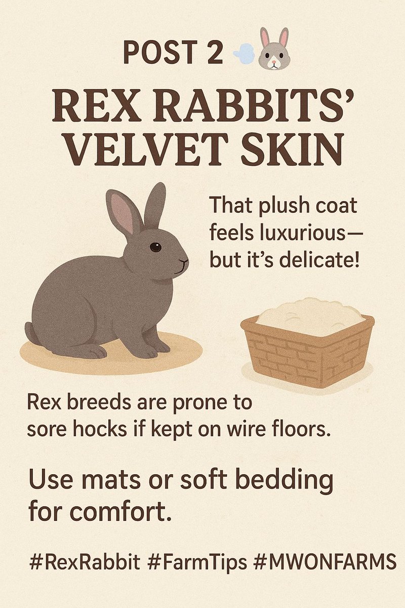 💨🐰 – Rex Rabbits’ Velvet Skin That plush coat feels luxurious—but it’s delicate! Rex breeds are prone to sore hocks if kept on wire floors. 🧺 Use mats or soft bedding for comfort. #RexRabbit #FarmTips #MWONFARMS