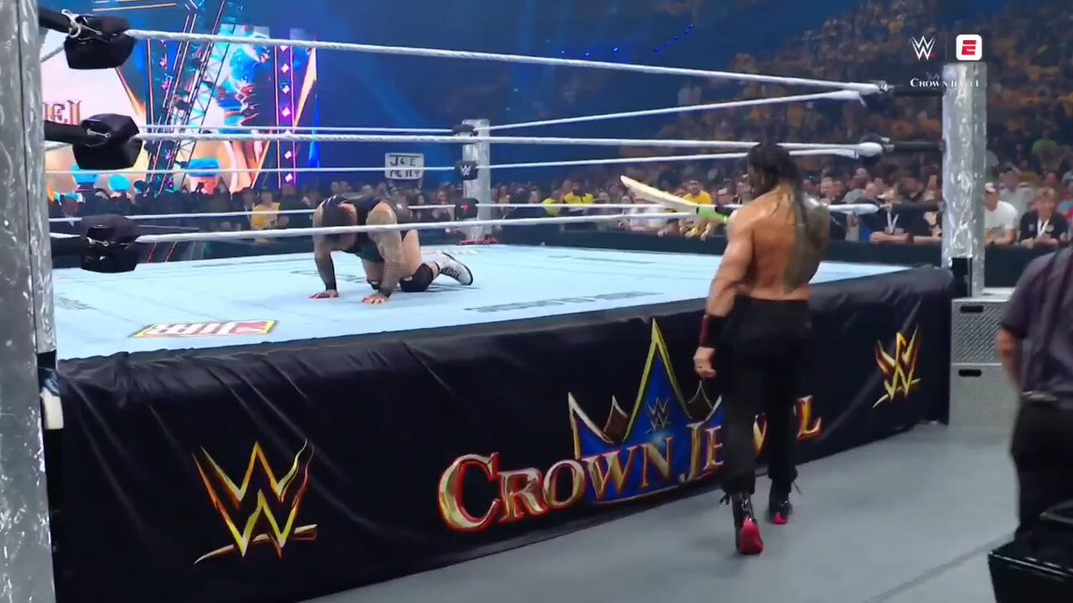 Oh dear...Misfire from Jey Uso...and a Spear to Roman. Big Bronson with a career defining win! Bloodline disbanded...till Survivor Series? #WWECrownJewel #JeyUso #RomanReigns