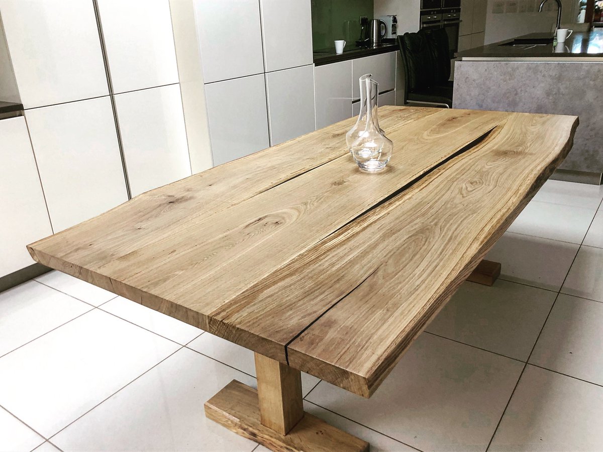 2200x~1000mm part live edge oak table, rustic features subtly enhanced with resin; T shaped matching timber legs. timberdeal.co.uk #oaktable #rusticoaktable #woodresintable #englishoaktable #liveedgetable #rawedgetable @EarthyTimber @Timberdeal