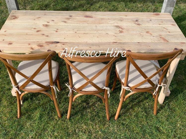 Wow.....We have been inundated with requests for a Rustic Trestle table, so here it is! Our new rustic table will look great with our rustic cross-back chairs or our new rustic benches. #rustic #weddings #rustictrestletable #crossbackchair