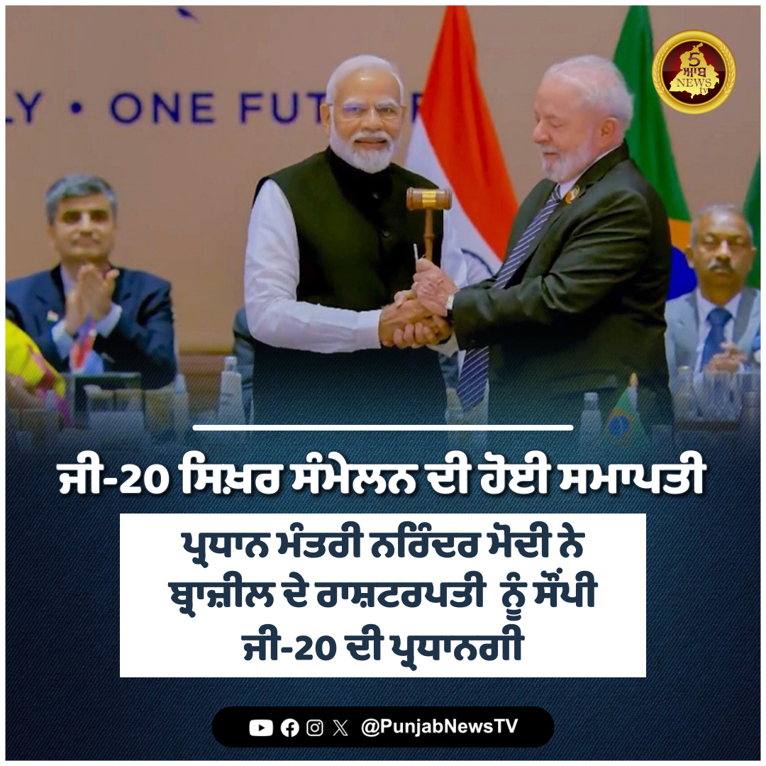 ਜੀ-20 ਸਿਖ਼ਰ ਸੰਮੇਲਨ ਦੀ ਹੋਈ ਸਮਾਪਤੀ, ਪ੍ਰਧਾਨ ਮੰਤਰੀ ਨਰਿੰਦਰ ਮੋਦੀ ਨੇ ਬ੍ਰਾਜ਼ੀਲ ਦੇ ਰਾਸ਼ਟਰਪਤੀ ਨੂੰ ਸੌਂਪੀ ਜੀ-20 ਦੀ ਪ੍ਰਧਾਨਗੀ | Punjab News tv #G20 #sammit #closing #today #PunjabNewstv