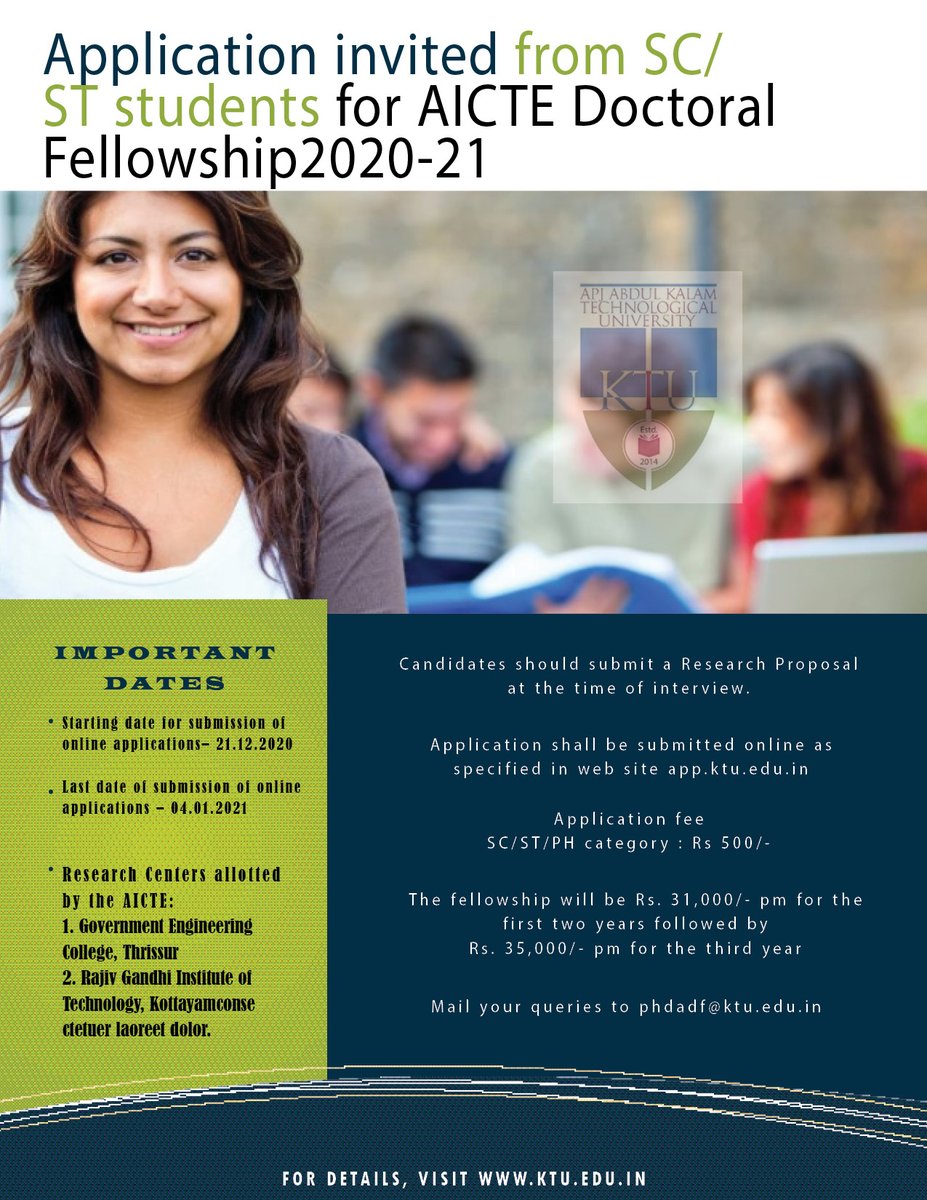 APJ Abdul Kalam Technological University invites applications from eligible candidates in SC/ST category for AICTE Doctoral Fellowship (ADF) for the year 2020-21 #ktuphd #scststudents #aictefellowship #aictedoctoralfellowship