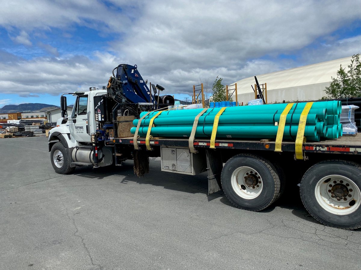 Pipes in motion! Our SDR pipes roll out from the ICONIX Kamloops, BC yard, to a job site in town! 🚚 #iconixww #SDRpipe #delivery