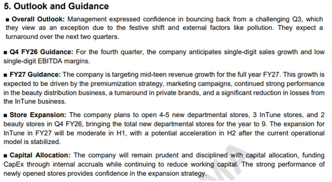 #SHOPERSTOP | 🔮 ScoutQuest Crystal Ball Future business outlook based on management commentary Outlook: Shoppers Stop anticipates a strong Q4 FY25 driven by seasonal weddings and promotions, with plans to expand by opening 26 INTUNE stores and 6 department stores. In FY26, they