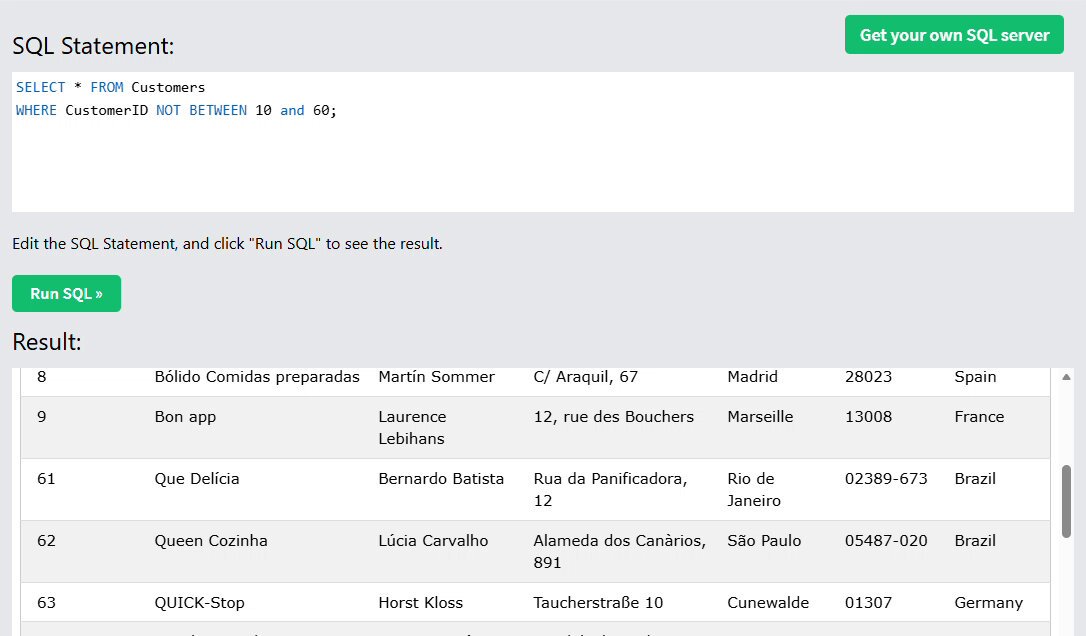 Here you go! Selecting customers with identity not between 10 and 60 using the "where" clause and "not between". Exciting! #sqldev #sqldata #sqlmaster