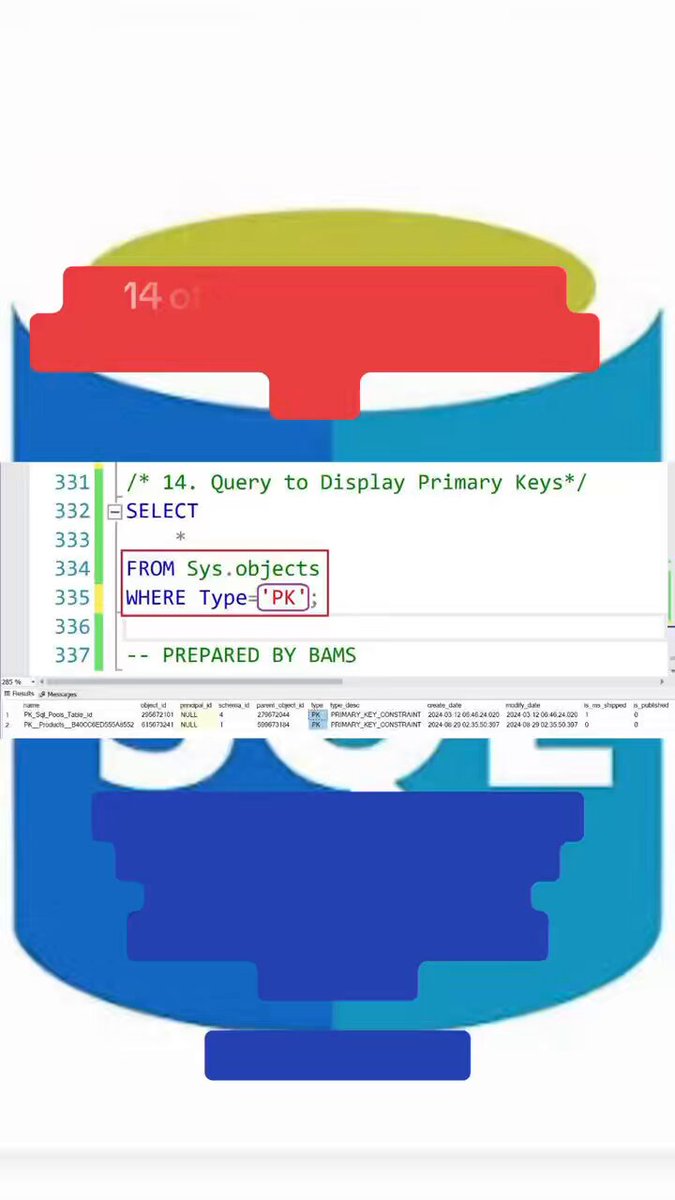 14 of 70 Top SQL Queries: Query to display Primary Keys 🔑 #PrimaryKey #SQLServerTips #LearnSQL #DatabaseDesign #SQLQuery #DataTok #PreparedByBams #TechTok #SQLHack #fyp #foryou #trending #dataanalytics #datascience #dataengineer #bams #viral